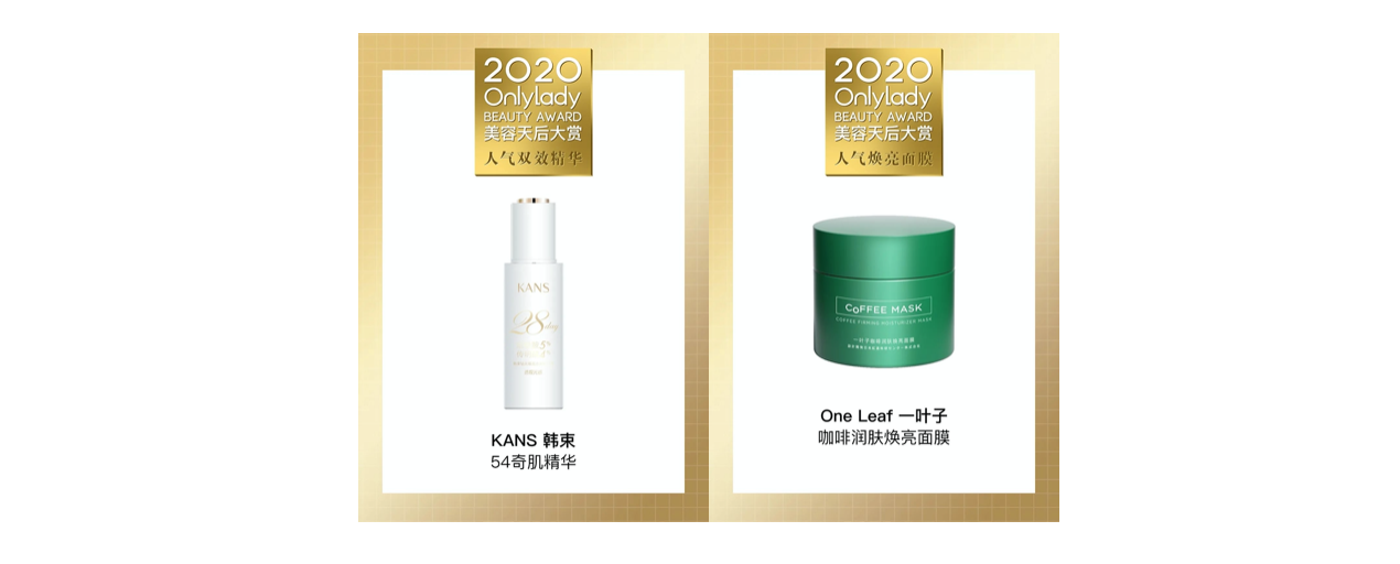 就在剛剛,2020 OnlyLady美容天后大賞榜單新鮮出爐,祝賀上美集團旗下韓束54奇肌精華榮獲人氣雙效精華獎,一葉子咖啡潤膚煥亮面膜榮獲人氣煥亮面膜獎!